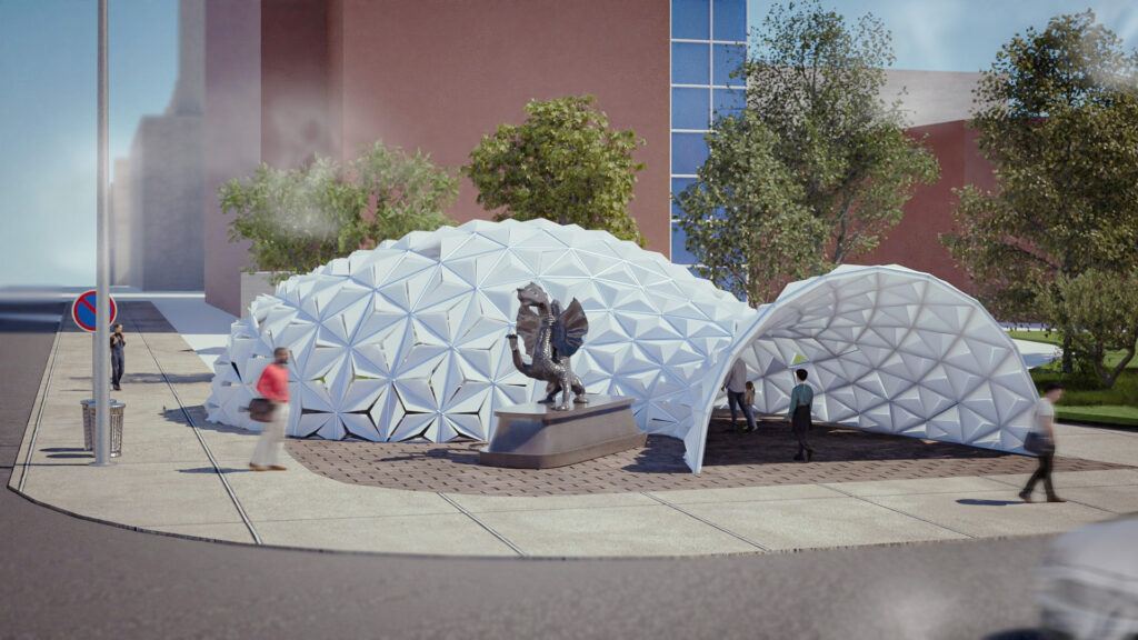 Dragon’s Tail studies how architecture responds to light through movement. Drawing from the patterns of a dragon’s tail and the form of Drexel’s Mario statue, the installation introduces a kinetic shading system made of triangular panels that react to changing sunlight. As the panels open and close, they regulate shade and airflow, creating a responsive environment that transforms a static public corner into an active, performative space.