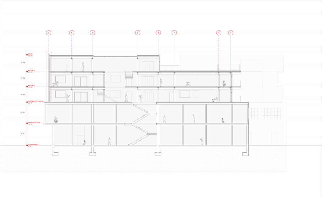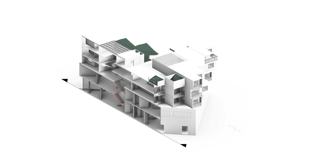 Reflecting the neighborhood’s social mix, the project offers a range of unit types for students, single families, and multi-family residents. Each unit is unique, creating a sense of identity and ownership that en-courages residents to care for their homes. A shared courtyard stair connects the housing to the community center below, promoting interaction and shared access to the rooftop.