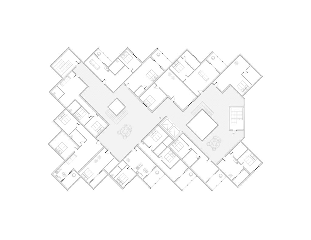 Spatially, the design optimizes natural sun-light through modular orientation, and accommodates a diverse range of housing typologies.